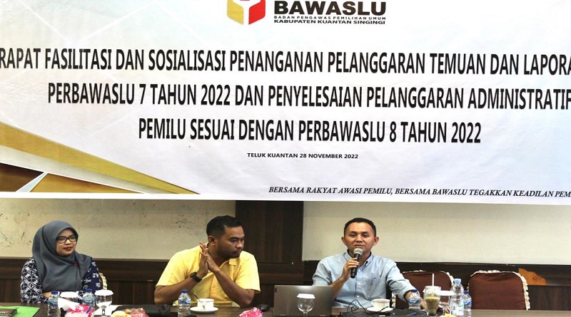 Teluk Kuantan (28/11/2022) – Badan Pengawas Pemilu Kabupaten Kuantan Singingi menggelar Rapat Fasilitasi dan Sosialisasi Penanganan Pelanggaran Temuan dan Laporan Pada Perbawaslu 7 Tahun 2022 dan Penyelesaian Pelanggaran Administrasif Pemilu sesuai Perbawaslu 8 Tahun 2022, di meetting room Rumah Makan Sederhana, Teluk Kuantan, Senin (28/11).